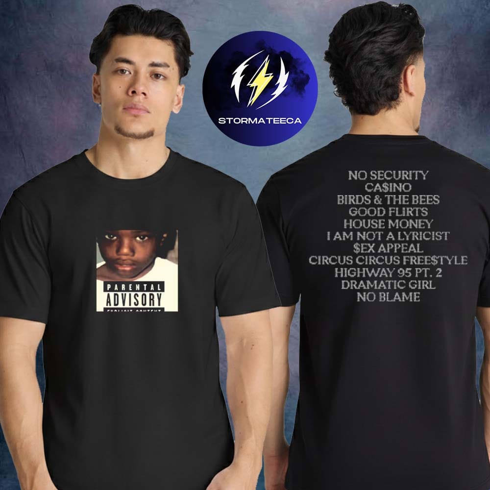 The front design evokes a cinematic, almost documentary-like feel—capturing a moment that feels both personal and symbolic. Paired with the “parental advisory” styling, it nods to the raw honesty and unfiltered perspective that define Baby Keem’s work. It’s a visual representation of youth, experience, and storytelling all at once.