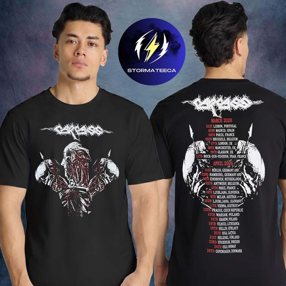 Step into the world of extreme metal with this Carcass tour dates shirt, inspired by the band’s 2026 European run. Known for their brutal precision and unmistakable aesthetic, Carcass delivers a design that feels as sharp and intense as their sound. The front artwork hits with raw, visceral energy, while the back documents the full tour journey across Europe. This piece isn’t just about merch—it’s about carrying the atmosphere of the stage, the noise, and the uncompromising identity of Carcass wherever you go.