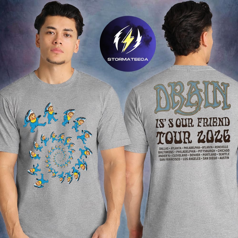 Fast, chaotic, and impossible to ignore—the Drain mascot tour tee captures the wild energy of the Is Your Friend Tour 2026 in a design that stands out instantly. Known for their explosive shows and playful hardcore identity, Drain brings something different to the scene, and this shirt reflects that perfectly. Featuring a hypnotic spiral of their iconic shark mascot on the front and bold tour graphics on the back, it feels like a visual extension of the pit. Whether you’ve been part of the crowd or just connect with their sound, this piece carries that same adrenaline into your everyday style.