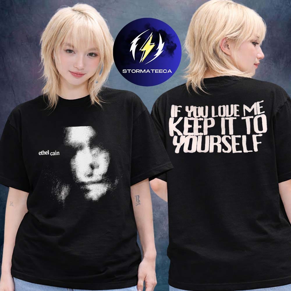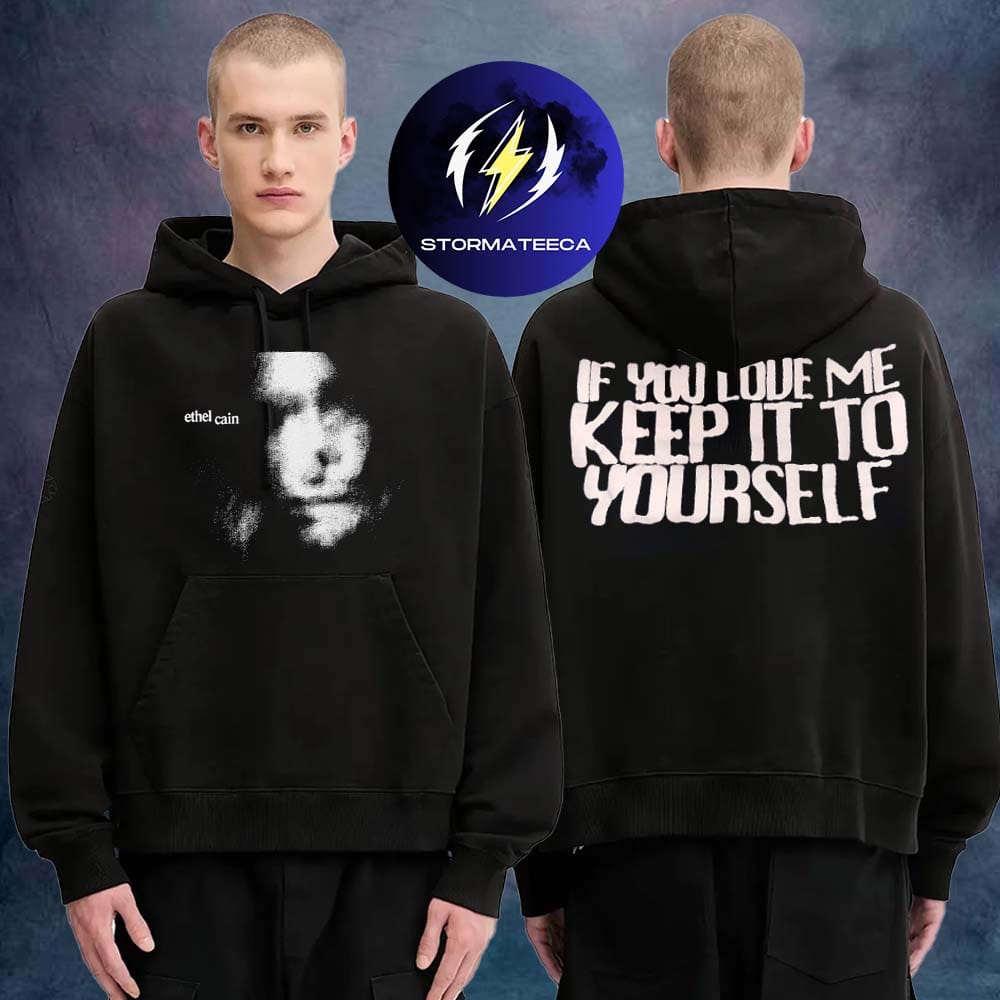 The back graphic—featuring the phrase “If you love me, keep it to yourself”—introduces a raw, confrontational edge. It speaks to the complexities of connection and vulnerability that run throughout her storytelling. This duality between front and back mirrors the push and pull present in her work: intimacy versus distance, expression versus silence.