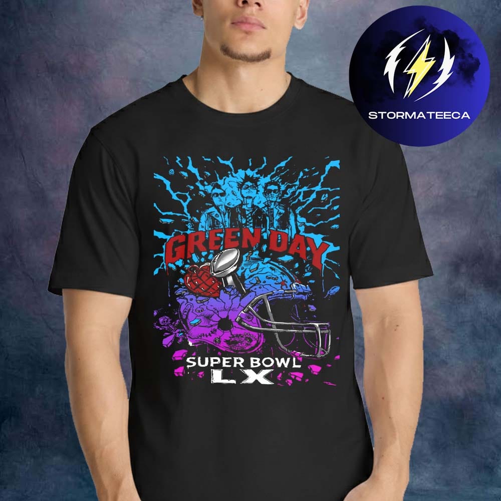 Celebrate the collision of punk rock rebellion and championship spectacle with the Green Day Super Bowl Helmet T-Shirt. Inspired by the cultural crossover surrounding Super Bowl LX, this design captures the explosive energy that defines both Green Day’s music and football’s biggest stage. The helmet graphic symbolizes impact, performance, and fearless attitude—qualities that echo the band’s decades-long influence on global rock culture. For fans who live loud, this tee transforms a historic moment into bold, wearable expression.