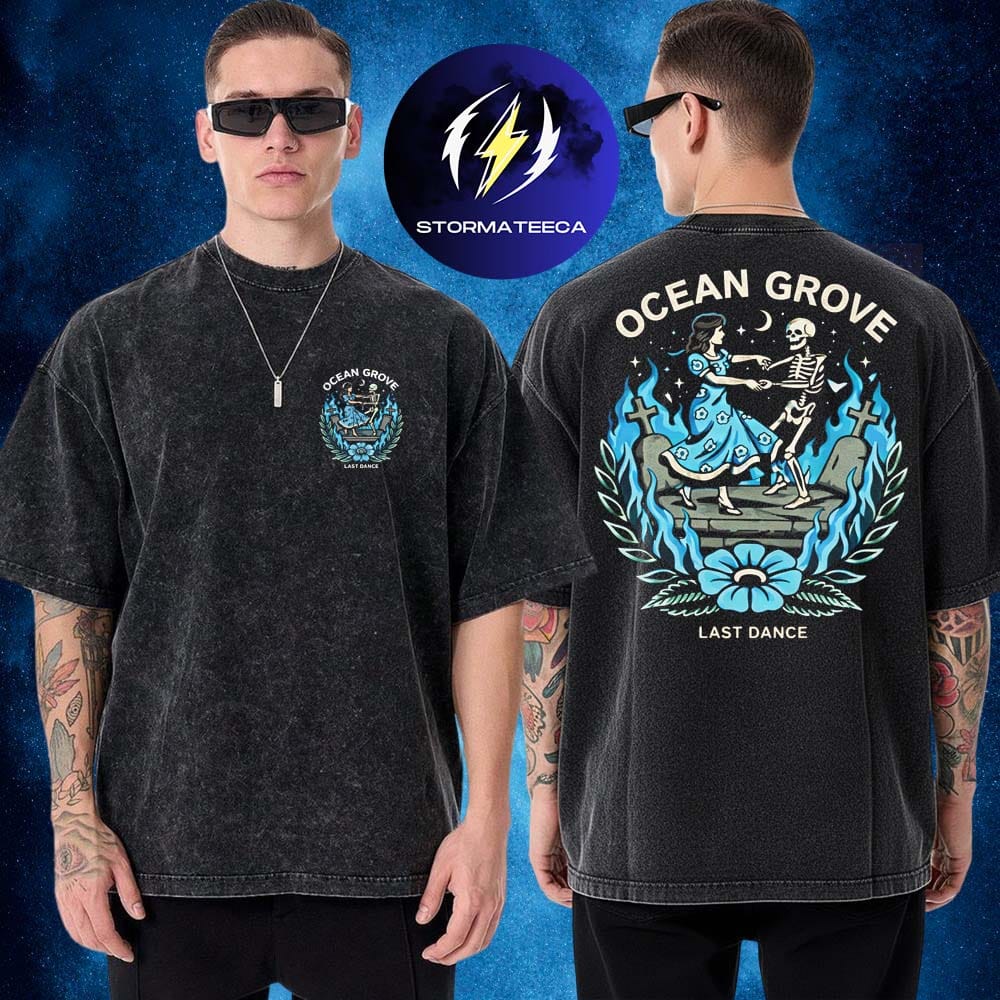 The artwork behind the Ocean Grove Last Dance concept draws from the classic symbolism of danse macabre—a visual tradition that represents the inevitable meeting between life and death. In the design, a woman dances with a skeleton beneath a moonlit sky, surrounded by flames and grave markers.