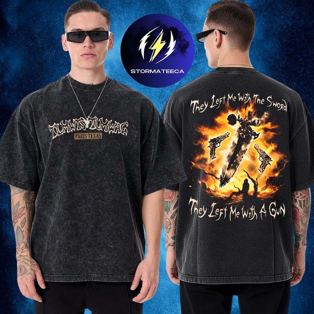 The Paris Texas They Left Me With Washed T-Shirt captures the gritty spirit and rebellious energy that define the duo’s music and visual style. Designed with a vintage washed finish and a powerful two-sided graphic, this shirt feels like a piece of underground culture rather than just merch. The dramatic sword-and-gun illustration paired with gothic lettering reflects the raw storytelling and cinematic mood that fans associate with Paris Texas. Whether you discovered them through explosive live performances or their boundary-pushing tracks, this shirt lets you carry that energy into everyday streetwear.