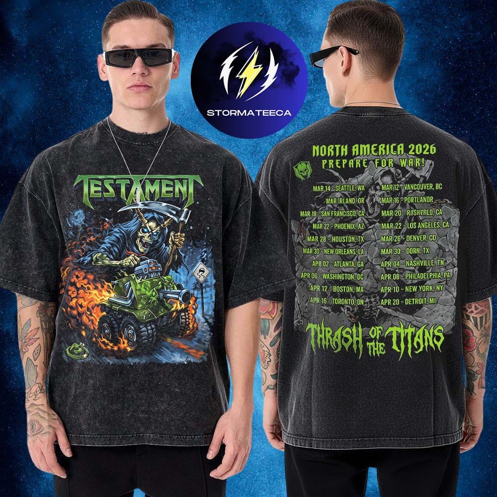 Thrash metal thrives on raw energy, rebellion, and relentless volume—and the Testament Thrash of the Titans 2026 Washed T-Shirt captures that spirit in a bold vintage-inspired design. Created to celebrate the band’s explosive North America tour, this two-sided tee combines aggressive artwork with a distressed washed finish that feels straight out of classic metal culture. With a striking front graphic and full tour dates printed on the back, the shirt represents the chaos, intensity, and unforgettable nights that define a Testament show. Whether you’re a longtime thrash fan or discovering the band’s legendary sound, this tee brings the tour energy into everyday style.