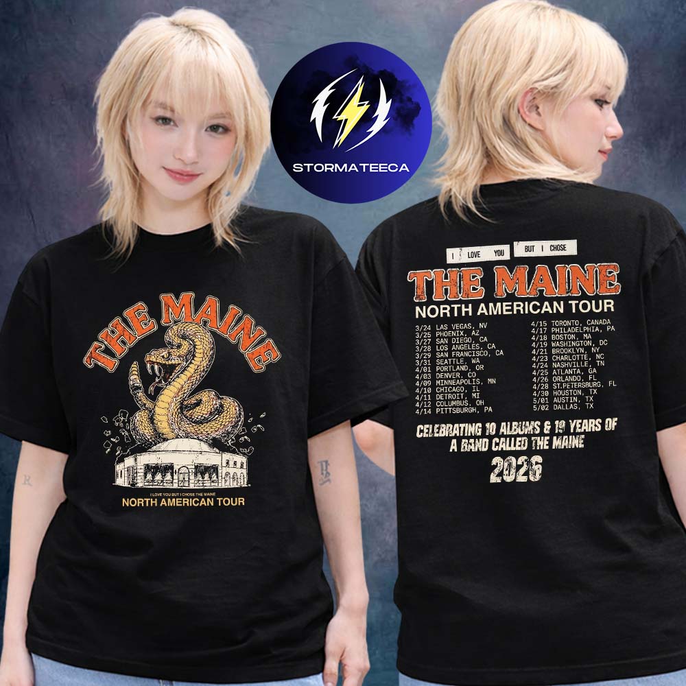 Step into the era of celebration, nostalgia, and raw connection with this The Maine snake tour 2026 T-shirt. Designed around the band’s North American tour, this piece captures the energy of a milestone moment—honoring years of music, growth, and fan loyalty. The bold snake graphic paired with detailed tour dates brings together classic rock-inspired visuals and modern fan culture. Whether you were in the crowd or following the journey from afar, this shirt lets you carry a piece of that experience with you wherever you go.