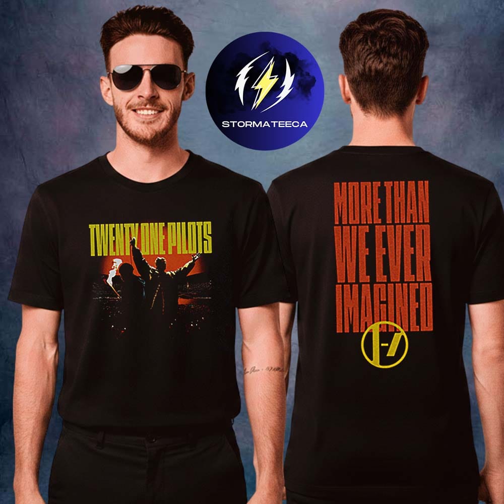The phrase “More Than We Ever Imagined” reflects the emotional foundation of Twenty One Pilots—music that speaks honestly about internal struggle, hope, and transformation. The two-sided design mirrors that duality: what we show the world versus what we carry inside. It represents becoming stronger through uncertainty and finding meaning in moments that once felt overwhelming. Wearing this T-shirt is a quiet statement of resilience and connection, understood instantly by fans who feel the same weight in the words.